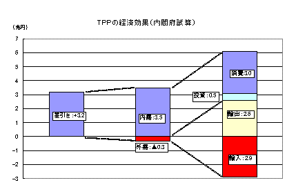 安倍総理の交渉参加表明と同時に政府が発表したTPPの経済効果に関する試算では、参加によって日本経済を3.2兆円、GDP比で0.66%押し上げる効果があるとされている。約3兆円という経済効果に対しては、小さすぎる、大きすぎるという両方の批判があるが、ここで注目したいのは金額の大小ではなく、効果の中身である。