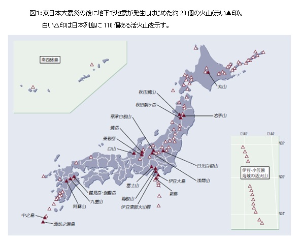 「3・11」で起きたようなM9クラスの巨大地震は、活火山の噴火を誘発する。実際、東日本大震災以後に地下で地震活動が増加した活火山が約20個ある(図1)。噴火する可能性としては、世界文化遺産に登録された富士山も例外ではない。1707年に起きた宝永地震(M9クラス)の49日後にマグマを噴出し、江戸の街へ大量の火山灰を降らせたのだ。