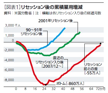 雇用も回復が遅れており、リセッション前の雇用水準をなお55万人下回る (図表1)。米国では移民を含め1%弱の人口増が続く。労働対象者の6割強が雇用市場に参入すれば、毎月13万人程度の雇用増が必要となる。リセッション前の水準回復は一通過点に過ぎず、当時の失業率4.7%(2007年11月)の回復には相当な時間を要しよう。