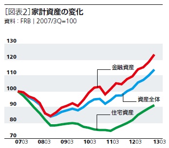 また、住宅価格や株価の変動は資産効果を通じ消費に影響する。家計資産は、リセッション前のピーク2007年7-9月期からボトムの2009年1-3月期までに16%減少(同株価は52%減)、その後は金融資産の回復が先行する一方、住宅価格の下落が続き家計資産全体が下落分を回復したのは2012年7-9月期となる。現在でも金融資産がピーク比23%増の一方、住宅資産は9%減に留まる。株式は富裕層の保有比率が高く、住宅資産の回復まで資産効果がマイナスに作用する世帯は多い (図表2)。