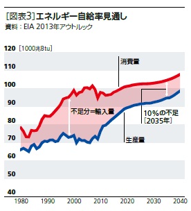 昨年11月発表のIEA(国際エネルギー機関)報告では「ロシアの生産次第では2013年中に最大の産出国となり、2035年にはエネルギーの国内自給が可能」と指摘しているが、米エネルギー庁(EIA)の見通しでは2035年のエネルギー自給率は90%とするなど、IEAほど楽観的ではない(図表3)。