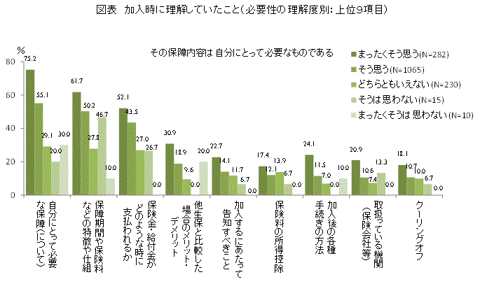 このような結果は、消費者が自身のニーズに則した保険商品を選択するためには、保険商品の内容よりも、自身のニーズに対する理解こそが肝要であることを示している。消費者自身がニーズに合った保険商品を選択するためには、まず、自身の生活設計や真に必要な保障とは何か、自身を顧みて検討する必要があるといえよう。