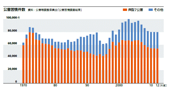 政府の統計(公害等調整委員会「公害苦情調査」)では、1970年代初めから公害は、大きく減少した。1980年代は公害苦情件数は全体では増えているが、工場による大気汚染のような典型的な公害(典型7公害)は減少傾向が続き、家庭生活から出たゴミの投棄や建物による日照不足、深夜の照明に対する苦情といったものが増えた(その他)。1996年度から再び件数は増加しているように見えるが、これは統計の取り方を変えたことが大きな要因のようだ。企業活動による大規模な公害は減少し、個人が原因となっている苦情が最も多くなっている。