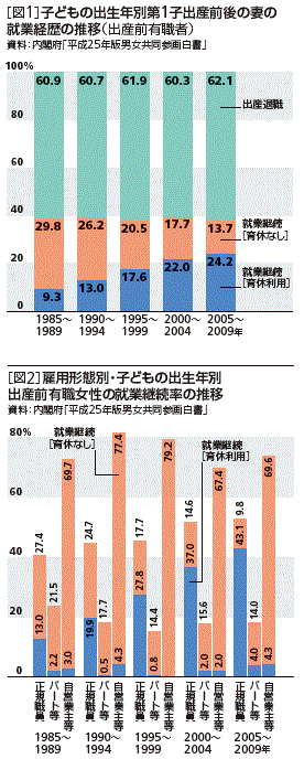 しかし、依然として、出産後の女性の就業継続率は低い。子どもの出生年別に第1子出産前後の妻の就業経歴をみると、直近でも就業継続者は出産前有職者の4割に満たない(図1)。また、就業継続率は、実はわずかに低下している。子どもの生まれ年が1985~1989年では39.1%だが、2005~2009年では37.9%である。