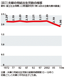 未婚者を除いた夫婦の状況をみると、夫婦の最終的な平均子ども数(完結出生児数)は、直近調査で2人をわずかに下回っているものの、1970年代から最近までおおむね2人程度で推移している(図3)。