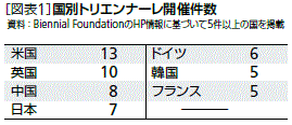 トリエンナーレについて、比較的信頼性が高いと思われるポータルサイトのひとつBiennial Foundationによれば、現在、世界各国で144件のトリエンナーレが開催されている。国別の件数は図表1のとおりで、日本は4番目に多い。ただしこのサイトに掲載されていないものも含めると日本は18件で(図表2)、世界で最もトリエンナーレの盛んな国のひとつであることは間違いない。