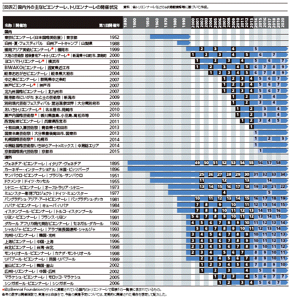 海外の主要なトリエンナーレ約20件をピックアップし、国内のものとあわせて開催地、最近の開始年と今後の開催予定を図表2に整理した。