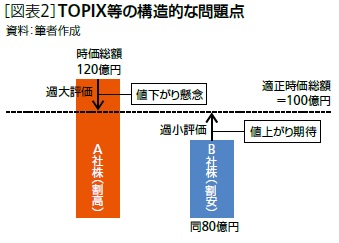 ところが、A社株は値下がりが懸念される一方、B社株は値上がり期待がある。従って時価総額で構成比を決めるのは矛盾しているとの指摘がある(図表2)。