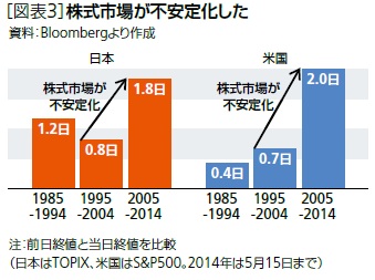 また、図表3のように株式市場の不安定性増大もある。1日に株価が±4%以上変動したのは、2004年以前は100日に1回程度であったが、直近10年は約2倍に増えた。米国でも急増しており、株式市場が不安定化した様子がみられる。