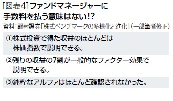 3人の学者がノルウェー政府年金基金の資産運用を評価し、「ファンドマネージャーに手数料を払って株式投資を委託する意味は乏しい」とも解釈できる衝撃的な結論を発表した(図表4)。これが欧州でスマートベータ普及の契機になったとされる。