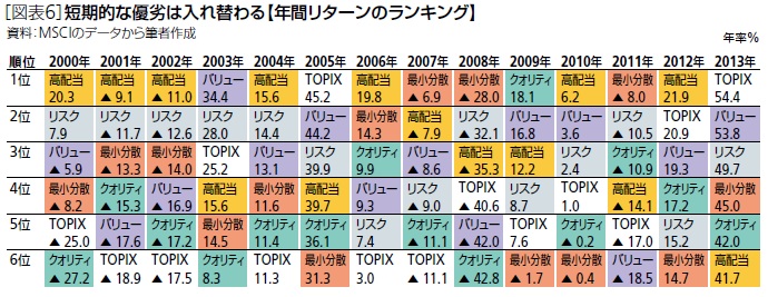留意すべきは“複数の”と“長期的には”という点だ。図表6に示したように、毎年の収益率の順位は大きく入れ替わる。例えばNISA口座に定められた5年間で投資する場合はスマートベータの中から“最良の1本”を探すことはあまり意味を持たない。複数を組み合わせてリターンの安定化を図ることが賢明となろう。