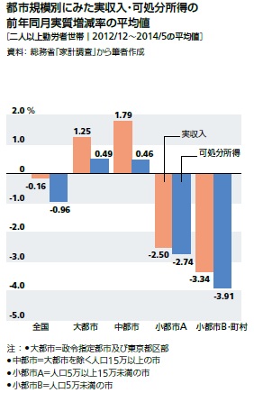 (3)都市規模別に実収入や可処分所得の推移をみると、いずれも、名目賃金は上昇するものの、物価の上昇により実質賃金は低下、という同様の傾向を示している。しかし、マイナスに転じた時期やその度合いが異なっている。都市規模が小さいほど、物価の上昇に対して賃金が増加しておらず、安倍政権発足以降の実収入等の増減率の前年同月比の平均値が小さい(図)。