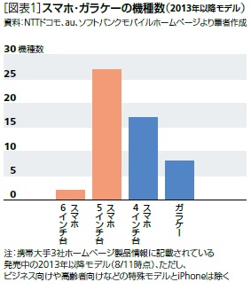 スマホ(スマートフォン)の巨大化が止まらない。登場初期には画面サイズ3インチ台が主流であったのがどんどん大きくなり、現在のラインナップは5インチ台が主流になっている。中には6インチ台も存在している。調べたところ、携帯大手3社がホームページに掲載しているスマホ製品(8/11現在、iPhone、2012年以前のモデルは除く)のうち、6割強が5インチ以上であった[図表1]。残りは4インチ台だ(3インチ台はなし)。過去の電子製品、特に持ち歩くものは技術進歩に伴って小型化していく流れが一般的であっただけに、特異な動きである。