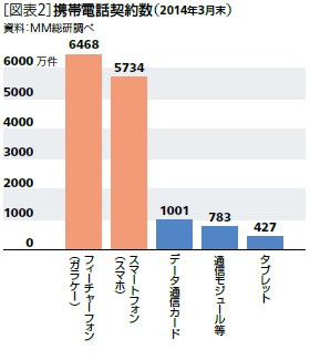 このように、消費者の嗜好は多様であるのに対し、供給者側(メーカーやキャリア)のスマホシフト、さらに巨大化の流れは顕著である。とりわけ問題に感じるのは、「一斉に右へならえ」的な動きを見せていることだ。巨大スマホ自体を否定するわけではないが、製品に占める巨大スマホの割合が一気に高まることで、小型スマホ派やガラケー派の選択肢は非常に限られてしまっている。例えば、ガラケーについて言えば、利用状況を示す契約数では依然としてスマホを上回っているにもかかわらず[図表2]、販売中モデル(2012年以前のモデルは除く)に占めるガラケーの割合はスマホの1/5にも満たない[図表1]。
