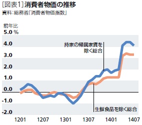 消費税率引き上げ後の物価高が家計を大きく圧迫している。消費者物価のうち、注目度が最も高い「生鮮食品を除く総合(以下、コアCPI)」は2014年4月以降、前年比で3%台前半の伸びを続けている。このうち2%分は消費税率引き上げによるものであり、消費者物価上昇率は基調としては1%台前半ということになる。日本銀行の2%の「物価安定の目標」も消費税の影響を除いたベースであるため、金融市場関係者は消費税の影響を除いたコアCPI上昇率を重視している。