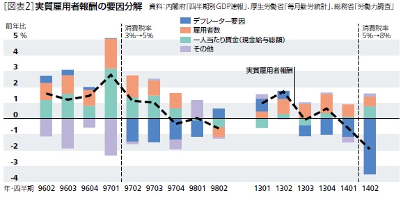 労働者の基本給にあたる所定内給与は2014年6月に2年3ヵ月ぶりの増加となり、好調な企業業績を受けて夏のボーナスも明確な増加となるなど、名目賃金の伸びは徐々に高まっている。しかし、消費税率引き上げによって物価上昇率が大きく高まったため、実質所得は大きく目減りしてしまっている。