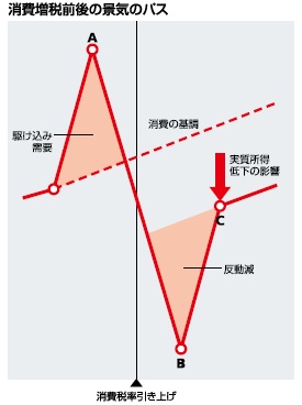 増税の反動減で売り上げが減少したという説明が良くみられるが、駆け込みの反動減と増税による直接の影響が混同されている。駆け込みの反動減は時間が経てば無くなるが、増税によって値上がりした効果は消滅しない。消費が元に戻るためには所得が増える必要がある。