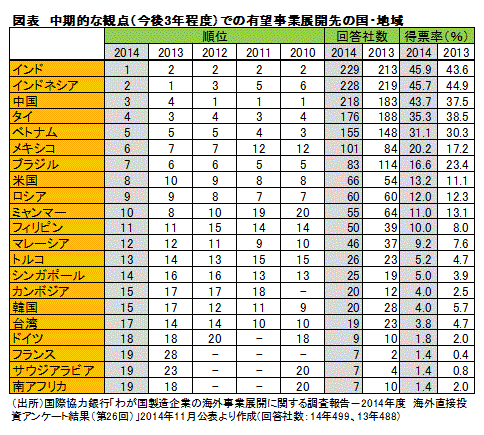 2014年11月28日、国際協力銀行(JBIC)が「わが国製造業企業の海外事業展開に関する調査報告-2014年度海外直接投資アンケート調査結果(第26回)-」を公表した。同調査は1989年以来年次で実施されており、その中の日本企業(製造業対象)による「中期的(今後3年程度)有望事業展開先国・地域」に関する設問は92年以来継続して実施されており、わが国企業の投資先の動向や関心・期待度を見る上で参考になる点が多い。