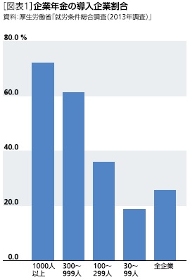 企業年金を導入する企業はこの10年で大きく減少した。厚生労働省が常用労働者30人以上の民間企業を対象に実施している「就労条件総合調査」によると、2003年の調査で全企業の46.4%であった企業年金の導入割合は、2013年の調査では25.8%まで低下している。なかでも従業員数が少ない企業の減少が顕著であり、この結果、従業員数が1,000人以上の企業では全体の72.1%で企業年金が導入されるのに対し、100~299人では36.1%、99人以下では18.6%に留まっている[図表1]。