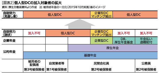 個人型DCは、個々人の自助努力をサポートする制度であるが、職種や働き方によって自助努力の手段に格差が生じるのは芳しくない。そこで打ち出されたのが、個人型DCの加入対象者の拡大だ。民間会社員や公務員を含む全ての国民が加入できるように改める方向である。ただしマッチング拠出を行う者は対象外とされた。マッチング拠出とは、企業型DCを導入する企業に勤める人が、企業の拠出に上乗せして拠出する自助努力を支援する仕組みであり、個人型DCと機能が重複するためである。