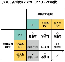 こうした就労形態の変化に対しては、現在でも、制度間のポータビリティと呼ばれる仕組みがある。転職前後の制度間で年金資産の移換を可能にし、将来年金として支給を受けられる可能性を確保するための仕組み*である。しかし、離転職のあらゆるケースに対応していないのが現状だ[図表3]。移換前の制度がDBの場合には、他の制度へ年金資産を移換することができる。しかし、移換前の制度が企業型・個人型DCの場合には、DCへの移換しか認められていない。DBのみしか導入していない企業に転職する場合には、年金資産を移換できないばかりか、転職先の制度で将来年金として支給を受けられなくなる可能性が高まるのだ。