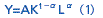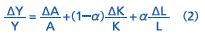 Yは実質GDP、Aは全要素生産性、 Kは資本投入量、Lは労働投入量、定数α(0<α<1)は労働分配率を表す。本稿ではα=0.67と仮定した。次に両辺を自然対数(ln)に変換し、時間で微分すると以下の式(2)となる。