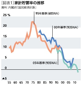2013年度の家計貯蓄率は、現在統計が利用可能な1955年度以降で初のマイナスとなった。かつて日本の家計貯蓄率は国際的に高いことで知られていたが、高齢化の影響もあって1970年代半ば頃から低下傾向が続いてきた。現行基準の国民経済計算でみると家計の貯蓄率は1994年度の11.8%から2013年度にはマイナス1.3%まで急低下[図表1]、貯蓄額は1994年度の36.1兆円から13年度の▲3.7兆円まで39.8兆円の急減少となった。