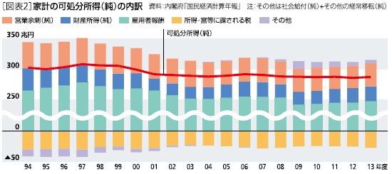 一方、可処分所得の8割以上を占める雇用者報酬は2010年度から4年連続で増加しているものの、2013年度の雇用者報酬は248.3兆円とピーク時の1997年度(279.0兆円)と比べると30.7兆円も低い水準となっている。また、超低金利の長期化によって利子所得が激減したことから、財産所得(純)が1994年度の36.3兆円から2013年度には24.0兆円と12.3兆円の減少となっている。