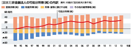 家計の所得低迷が長期化する一方、企業の所得は増加傾向が続いており、非金融法人の可処分所得(純)は2013年度に32.6兆円と過去最高を更新した[図表3]。内訳をみると、本業で上げた利益に相当する「営業余剰」は足もとでは持ち直しているものの2013年度は51.9兆円とリーマン・ショック前の2007年度(54.8兆円)の水準を依然として下回っている。
