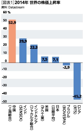中国では経済成長の鈍化傾向が続いている。2014年の実質GDP成長率は前年比7.4%増と前年の同7.7%増を0.3ポイント下回った。これを受けて国有企業(除く金融機関)の業績も減速、2014年の売上高は前年比4.0%増(2013年は同10.8%増)、純利益は前年比3.4%増(2013年は同5.3%増)となっている。ところが、2014年の中国株は勢い良く上昇した。代表的な株価指数である上海総合は前年末比52.9%と急伸した。日本株(日経平均)の同7.1%上昇、米国株(NYダウ工業)の同7.5%上昇を遥かに上回るとともに、モディ首相誕生で賑わったインド株(SENSEX)の同29.9%上昇やジョコ・ウィドド大統領誕生で盛り上がったインドネシア株(ジャカルタ総合)の同22.3%上昇をも大きく上回る上昇率である。