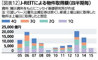 2015年第1四半期の東証REIT指数(配当除き)は、昨年末の流れを引き継いで続伸して始まったものの、その後は長期金利の不安定な動きや公募増資の増加に伴う需給悪化などを受けて、前年末比▲1.8%下落した。第1四半期のJ-REITによる物件取得額(引渡しベース)は4,961億円で取得環境は引き続き厳しいものの、取得額は前年同期とほぼ同水準となった[図表12]。