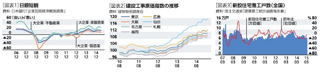 個人消費の持ち直しと企業収益の改善を背景に、景気は緩やかな回復基調にある。2015年3月の日銀短観では、業況判断指数(DI)が大企業製造業は横ばいとなる一方で、大企業不動産業のDIが33と高水準であったことも影響し、大企業非製造業はやや改善した[図表1]。