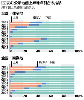 3月に公表された2015年1月公示地価は、全国全用途で▲0.3%と前年の▲0.6%から下落率は縮小し、上昇地点割合は32.9%と前年の30.9%からやや増加した。三大都市圏では昨年に続き約半数の地点(51.6%)で上昇。地方圏は69.3%の地点が下落したものの前年の76.1%からは下落地点割合は縮小した。しかし、住宅地、商業地とも上昇地点割合は2007年および2008年の水準には達していない[図表4]。全国で最も上昇率が高かった商業地は、北陸新幹線の開業の恩恵を受けた金沢駅前で17.1%の上昇、住宅地では避難世帯の流入による住宅需要の高まりから、上位10地点の全てがいわき市となった。東京圏の商業地では、上位10地点のうち8地点を銀座が占めた。