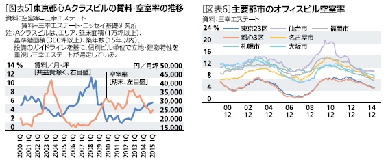 東京のオフィス市場では、賃料が緩やかではあるが着実に上昇してきている。三幸エステートとニッセイ基礎研究所が共同で開発した成約賃料データに基づくオフィスレント・インデックスによると、2015年第1四半期の東京都心部オフィス賃料は、Aクラスビル で31,166円/坪、前期比+1.9%と3四半期連続で上昇している[図表5]。Aクラスビルの空室率は、4.8%で6期ぶりの上昇となったが、これはまとまった空室を抱えたビルが竣工した影響による。賃貸市況の改善は地方主要都市でも継続しており、仙台を除く主要都市で空室率の改善が見られた[図表6]。