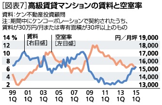東京都心のマンション賃料は、上昇基調にある。高級賃貸マンションの空室率は低下傾向が続き、それにともない賃料も上昇、2009年第1四半期の水準を上回った[図表7]。