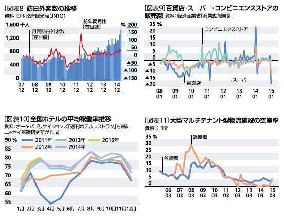 ホテルもまた訪日外客数増加を背景に昨年をさらに上回る稼働率を維持、15年3月は、前年同月比+2.0%の81.7%であった[図表10]。力強い需要を背景に、既存ホテルへの投資が活発化するとともに、ホテル会社やデベロッパーによる新規開発計画も相次いでいる。