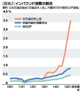 ただし、その一方で外国人(非居住者)の日本国内における消費額 が国内の消費額全体に占める割合は1%以下、GDP比では0.5%程度にとどまっている[図表2]。外国人による日本国内での消費(GDP統計ではサービスの輸出に計上される)が実質GDP成長率をどれだけ押し上げたかを試算すると、2015年4-6月期は前期比0.03%(年率0.11%)で、過去最大となった2014年10-12月期でも前期比0.08%(年率0.31%)にとどまっている。訪日外国人旅行者数の急増が一部の業界に大きな恩恵をもたらしていることは確かだが、日本経済全体に与える影響は現時点では限定的といえるだろう。