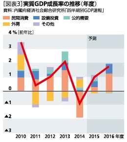 実質GDP成長率は2015年度が1.0%と2014年度のマイナス成長(▲0.9%)の後としては低成長にとどまるが、2016年度は2017年4月に予定されている消費税率引き上げ(8%→10%)前の駆け込み需要による押し上げもあって1.8%と高めの成長になると予想する[図表3]。