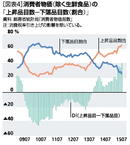 一方、物価上昇がある程度継続してきたこともあり、かつてに比べて企業の値上げに対する抵抗感は小さくなっている。実際、円安による原材料価格の上昇に対応した価格転嫁は幅広い品目で行われており、品目数でみれば上昇品目数が6割を超え下落品目数を大きく上回っている[図表4]。値上がりが目立つのは食料品だが、トイレットペーパー、ポリ袋などの日用品、宿泊料、テーマパーク入場料、月謝類などのサービスでも幅広い品目で値上げが行われている。コアCPI上昇率は前年比でゼロ近傍となっているが、物価上昇の裾野は広がっている。