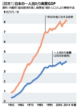 アメリカの一人当たり実質GDPは、2014年には1930年の6.4倍で、このペースで増加すると2030年には9倍近くに達する。日本は1955年度から2014年度までの60年間で8.3倍に達している。1930年を基準にすればもっと高い伸びになるはずだ。