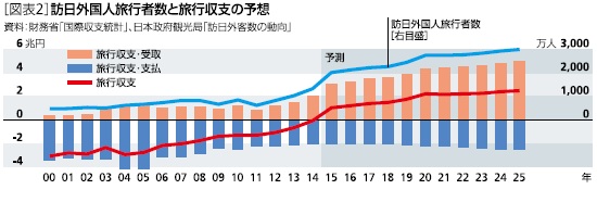 旅行収支は2015年に黒字に転換した後、2025年には2.5兆円程度まで増加するだろう。旅行収支の受取額は2014年の2.0兆円、GDP比0.4%から2025年には5.0兆円、GDP比0.8%まで拡大すると予想する[図表2]。