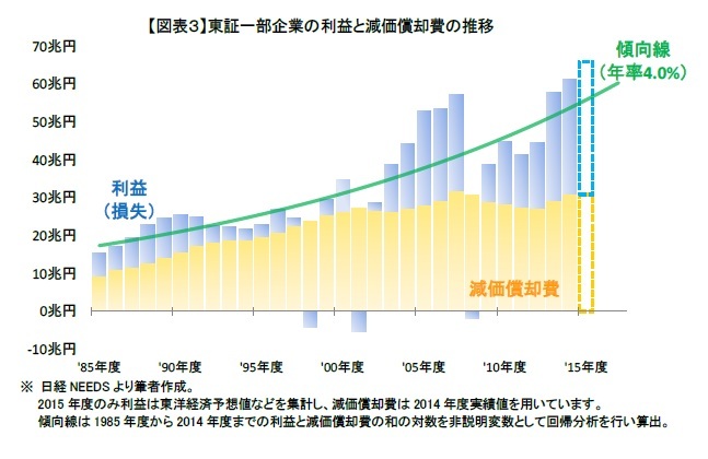 30年間、上下動を繰り返しながらも利益と減価償却費の和は拡大傾向にありました。指数近似で傾向線(【図表3】の緑線)を引いてみると、業績の拡大スピード、いわば潜在成長率は年率で4.0%でした。ここで傾向線は東証一部企業の景気などに左右されない実力といえるのではないでしょうか。