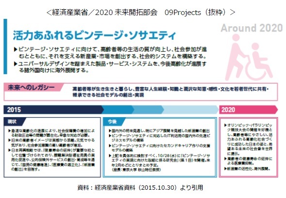 “ビンテージ・ソサエティ”とは、おそらくほとんどの人が初めて聞いた言葉になるであろう。“ビンテージ(Vintage)”とはもともとワインの製造工程を表す言葉であるが、今日では「年代もの。ただ古いだけでなく、年月を経て程良く味わいがでたもの1」という意味でよく使われる。ビンテージ・ワイン、ビンテージ・ファッションなどがそうだ。では、ビンテージ・ソサエティとは何か、これは“超高齢社会”を言い換える形で登場した「造語」であり、経済産業省がその発信元である。経済産業省の産業構造審議会内に設置された「2020未来開拓部会2」が掲げるプロジェクトの名称の中で使われている。当部会は東京オリンピック・パラリンピックが開催される2020年に向けて、持続的に成長する我が国の未来像を検討することを目的に設置され、現在、2020年に向けた産業振興の柱として9つのプロジェクト(テーマ)3を掲げている。その一つに、「活力あふれる“ビンテージ・ソサエティ”」がある。なお、筆者は当プロジェクトに紐付く「ビンテージ・ソサエティの実現に向けた取組みに関わる研究会(及び調査研究事業)」に携わっている。