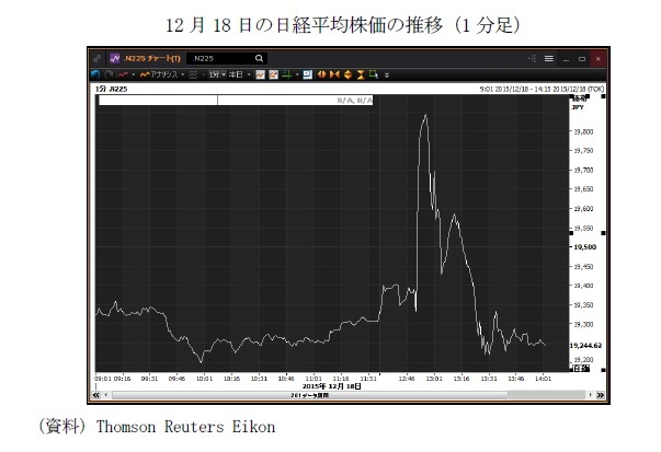 12月18日の12時30分過ぎ、日銀は金融緩和策のひとつとして実施しているETF(上場投資信託)の買入枠を現在の年間3兆円から3,000億円増やして3兆3,000億円に拡大することを発表した。その直後、株価は急上昇したが、すぐに発表前の水準より値下がりした。何があったのか。