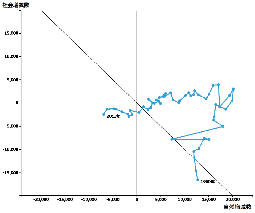 利点の2つめは、データの見方を勉強できる点である。データを見る際には独自の視点も重要だが、基本的な見方を押さえておくことも重要である。例えば「人口マップ」のメニューでは、人口増減を自然増減(出生や死亡による増減)と社会増減(転入出による増減)に分解した図を見ることができる(図表1)。