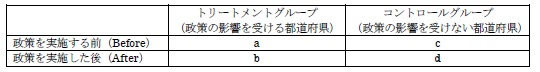 上記の表を用いて説明すると、トリートメントグループ(政策の影響を受ける都道府県)の政策の実施前後の効果(b-a)には、政策の効果のみならず、時間が経つことにより発生する外生的要因も含まれていると言える。一方、コントロールグループ(政策の影響を受けない都道府県)の政策の実施前後の効果(d-c)には、時間の変化による外生的効果だけが反映される。ということは、(b-a)から(d-c)を除くことにより、時間の変化による外生的効果を除いた、純粋な政策効果が得られることになる。但し、一つ注意すべきことは、外生的効果はトリートメントグループとコントロールグループともに同じであると仮定する必要がる。これが差分の差分法の主な内容である。