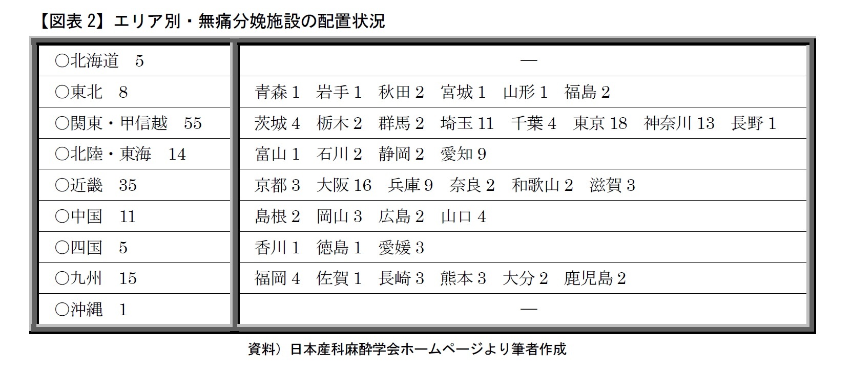 また47都道府県中、39都道府県にしか無痛分娩施設がない。8県(新潟、山梨、福井、岐阜、鳥取、高知、宮崎、長崎)には2015年10月の同学会のデータでは無痛分娩施設がゼロという状況である。