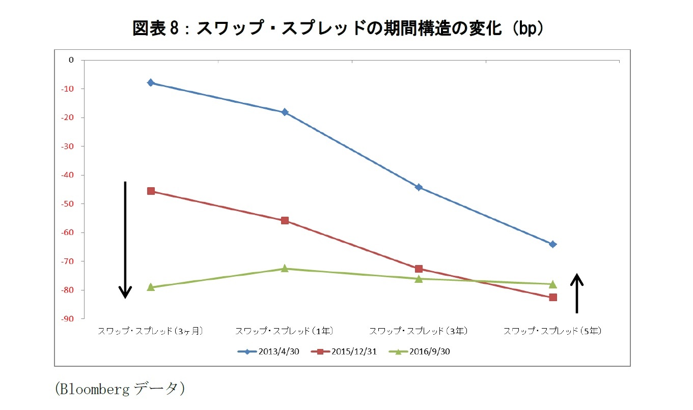 しかし、2015年12月にFRBにより利上げが決定され、かつ2016年1月に日銀によりマイナス金利政策が導入されたあたりから、銀行と生命保険による米ドル資金需要が増加に転じている。この米ドル資金需要の増加は、スワップ・スプレッドにおいて、3ヶ月と1年についてはマイナス幅の拡大方向、3年についてはほぼ現状維持、5年についてはマイナス幅の縮小方向へ寄与したようである(図表8)12。つまり、マイナス金利政策の導入によって、スワップ・スプレッドの期間構造に急激な「フラットニング」が生じている。しかしながら、3年や5年といった年限で大きな水準シフトが生じたわけではない。このことは、マイナス金利政策以降の米ドル資金需要の増加による通貨スワップや為替スワップの取引は3ヶ月や1年といった比較的短期に集中していたことを意味している。具体的には、通貨スワップや為替スワップの利用に際して、3年や5年といった期間でヘッジ取引を行うとヘッジコストが大きくなってしまうため、ヘッジコストが相対的に小さくすむ3ヶ月や1年といった期間で区切ってヘッジ取引を行う方向に取引の需要が変化したのではないかと思われる。2016年9月末時点では、スワップ・スプレッドの期間構造はほぼ完全にフラットな形状になっており、3ヶ月や1年といった期間で区切ってヘッジ取引を行うインセンティブはなくなってしまっている。