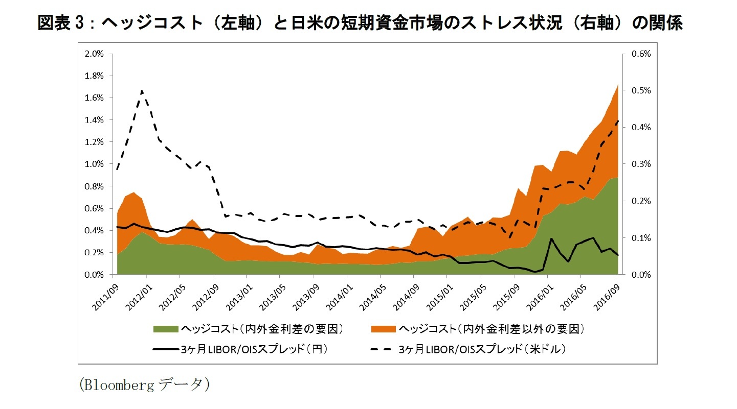 以上より、金融政策や金融規制による複合的な要因から、米国短期資金市場においてストレスが相対的に高まったことで、内外金利差以外の要因による追加的コストについても徴求されるようになったと考えられる。よって、米国短期資金市場のストレスが相対的に高まると、内外金利差の拡大と内外金利差以外の要因への影響が織り重なってヘッジコストの上昇に2重のインパクトを及ぼすことになり、非常に厄介な問題である。