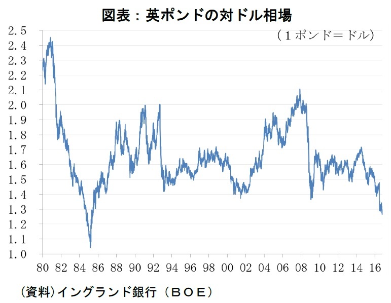 英ポンドの対ドル相場が1ポンド=1.3ドルを割込む31年振りの安値圏に達している(図表)。ポンド相場は、6月23日の欧州連合(EU)離脱を決めた国民投票の結果判明後に急落した後、しばらくは落ち着いていた。離脱という結果が引き起こした政治的な混乱が、残留派のメイ首相率いる政権の発足で比較的短期に収拾したことが下支えとなった。さらに、実際の離脱はまだ先であり、離脱してもEUの単一市場への自由なアクセスを大枠では保つ「ソフト・ブレグジット」に落ち着くのではないかという期待もあった。